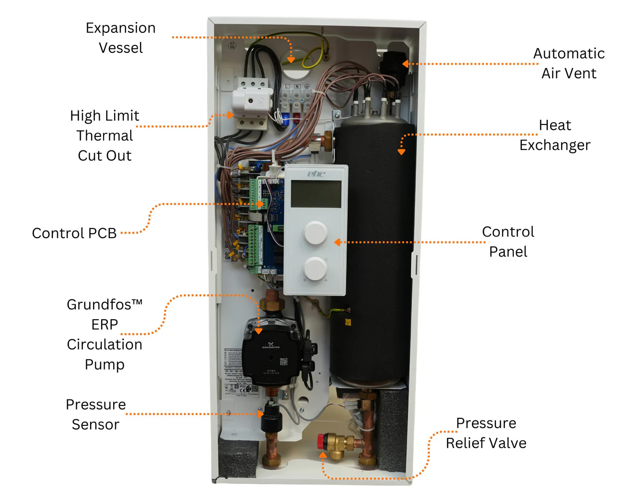 - Full Safety Suite: Includes pressure relief valve, auto air vent, circulation pump, and expansion vessel.