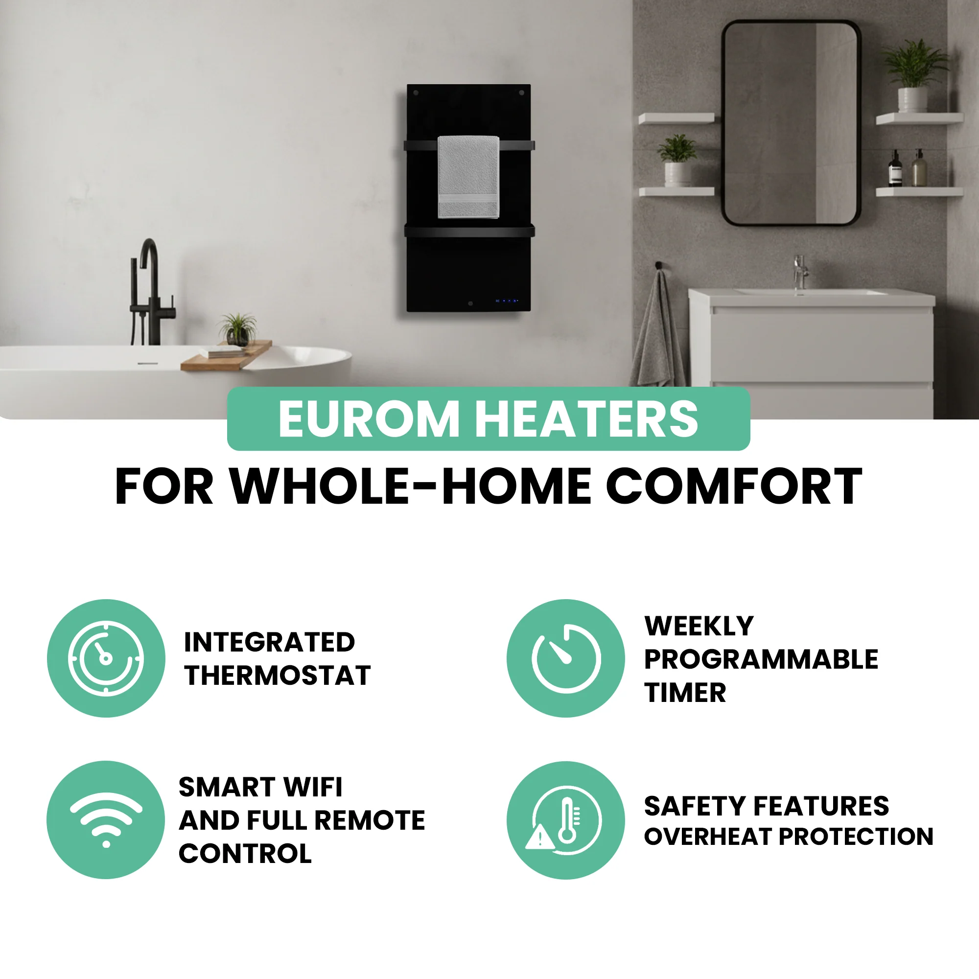 Remote control and scheduling via the Eurom Smart App enable convenient, energy-efficient heating management, ensuring your bathroom is warm when you need it without wasting energy.
