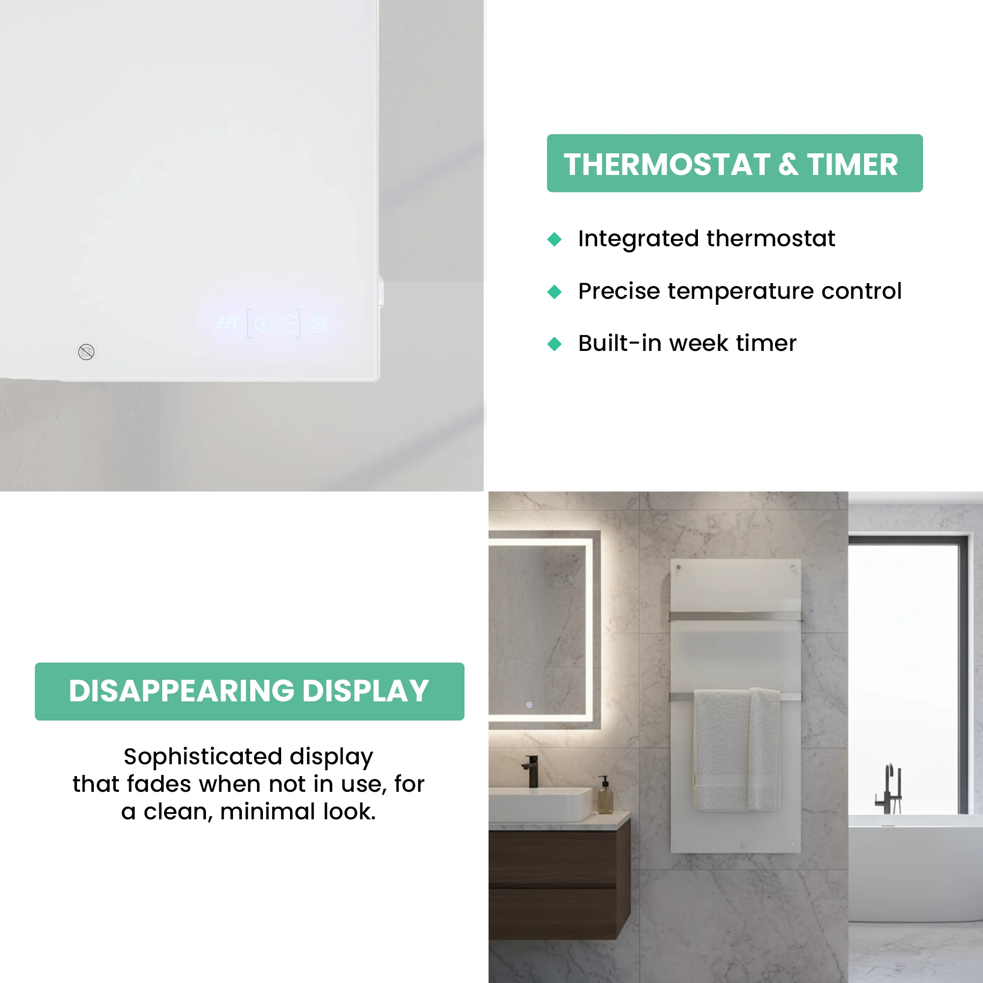 - Powerful Infrared Heating: 600 Watts providing quick and direct heat, perfect for medium-sized bathrooms.