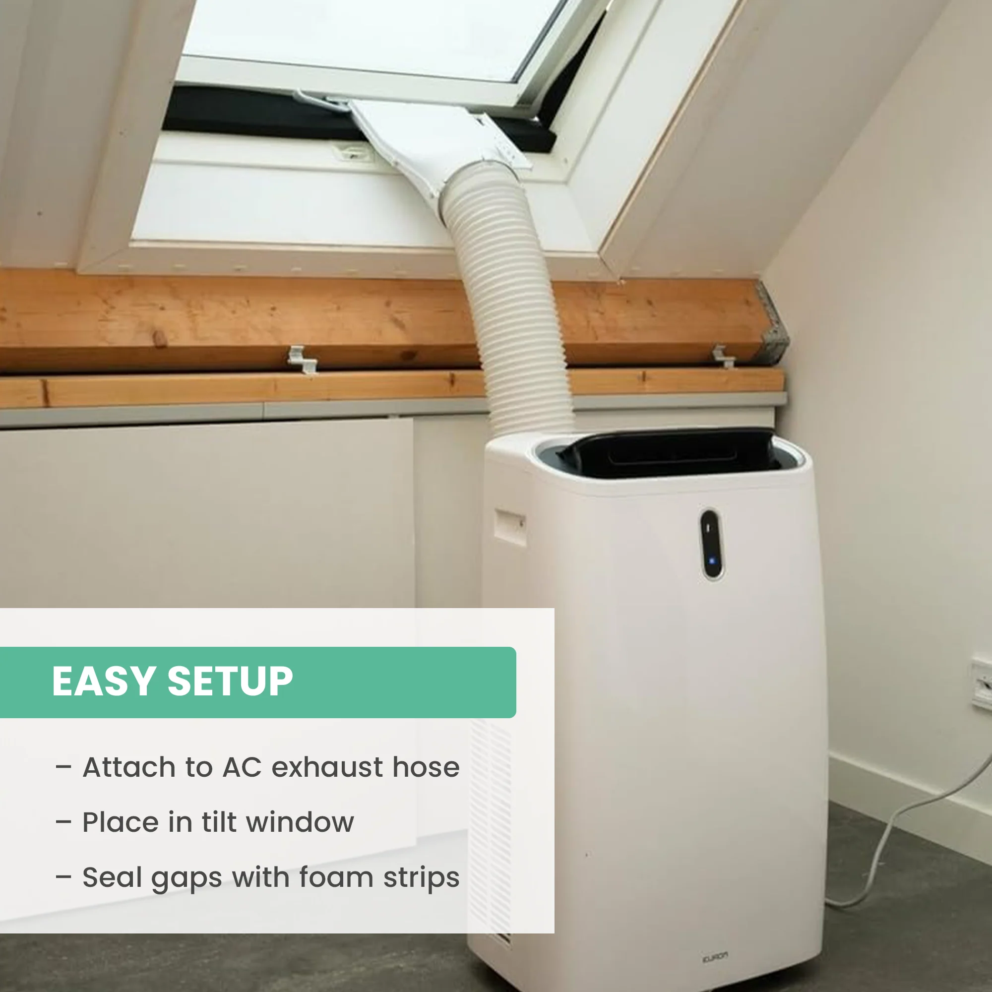 Attach this window outlet to your mobile air conditioner's exhaust hose, then fit it securely into the window frame of your tilt-and-turn or skylight window. Use the included foam strips to seal any gaps for improved airflow and efficiency. This setup allows you to keep windows securely closed or partially open, maintaining safety while effectively venting hot air outside.