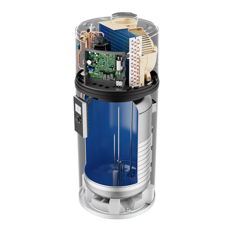 - Integrated R290 heat pump — compact floor-standing unit, no outdoor unit required, minimal installation footprint